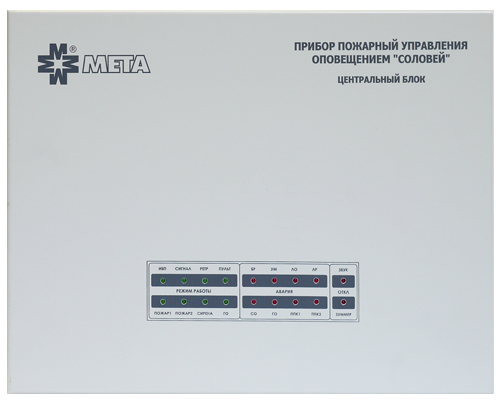 Центральный блок СОЛОВЕЙ-ЦБ. Выходная мощность 50 Вт, выходное напряжение 30 В, подключение сигналов ГО и ЧС, подключение речевых и световых оповещателей по схеме «звезда»,подключение двух микрофонных пультов, два перезаписываемых сообщения по 18 секунд каждое, два входа «ПОЖАР» от ППК для запуска сообщений. Контроль линий речевых и световых оповещателей на КЗ и обрыв, контроль линий связи с блоками расширения СОЛОВЕЙ-БР и с другими центральными блоками СОЛОВЕЙ-ЦБ на КЗ и обрыв.