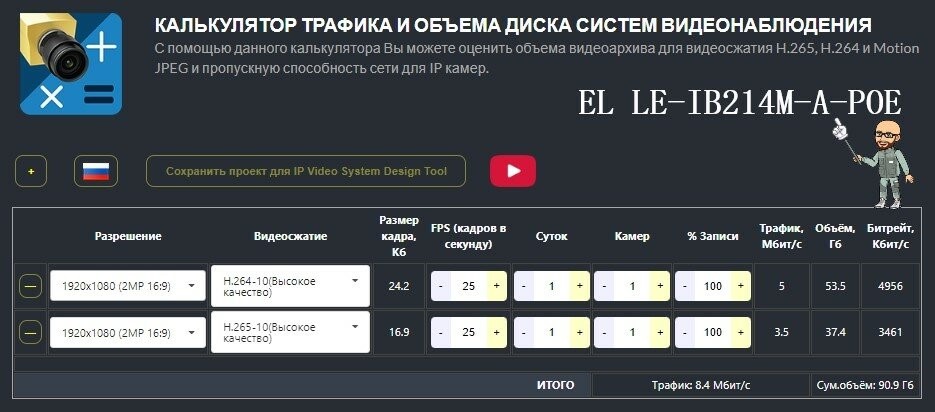 На странице устройства есть следующие характеристики: - 2 МП (1920 × 1080) - Сжатие видео H.264/H.265 Раз уж я стал использовать для обзора регистраторов он-лайн калькулятор потоков от JVSG, то не будем изменять традиции.
